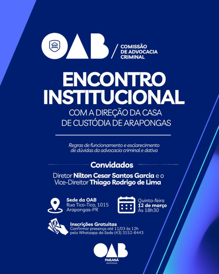 As inscriรงรตes sรฃo ๐ด๐ฟ๐ฎ๐๐๐ถ๐๐ฎ๐, com confirmaรงรฃo de presenรงa atรฉ ๐ญ๐ญ/๐ฌ๐ฏ ๐ฎฬ๐ ๐ญ๐ฎ๐ต, pelo WhatsApp da sede da OAB Arapongas: (43) 3152-6443.