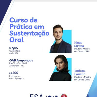 Curso de Prática em Sustentação Oral, OAB Arapongas OAB Arapongas • Capacitação prática Curso de Prática em Sustentação Oral Você se sente preparado para sustentar oralmente? Saber falar bem no momento certo pode mudar o rumo do seu processo. Destaque-se na prática, com um curso pensado para desenvolver técnica, presença,...