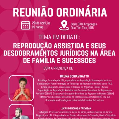 Reunião Ordinária, Comissão de Direito das Famílias, OAB Arapongas OAB Arapongas • Comissão de Direito das Famílias Reunião Ordinária Um encontro para debate qualificado sobre temas atuais e sensíveis do Direito de Família e das Sucessões. Tema em debate: Reprodução assistida e seus desdobramentos jurídicos na área de família e...