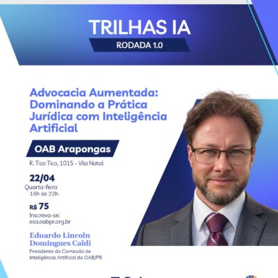 Trilhas IA - Rodada 1.0 Trilhas IA · Rodada 1.0 Arapongas · OAB Subseção Advocacia Aumentada Prática Jurídica com Inteligência Artificial A inteligência artificial já está transformando a advocacia. A pergunta é: você está usando-a em seu favor? // O que você vai aprender ⚡ IA na Prática Como usar...