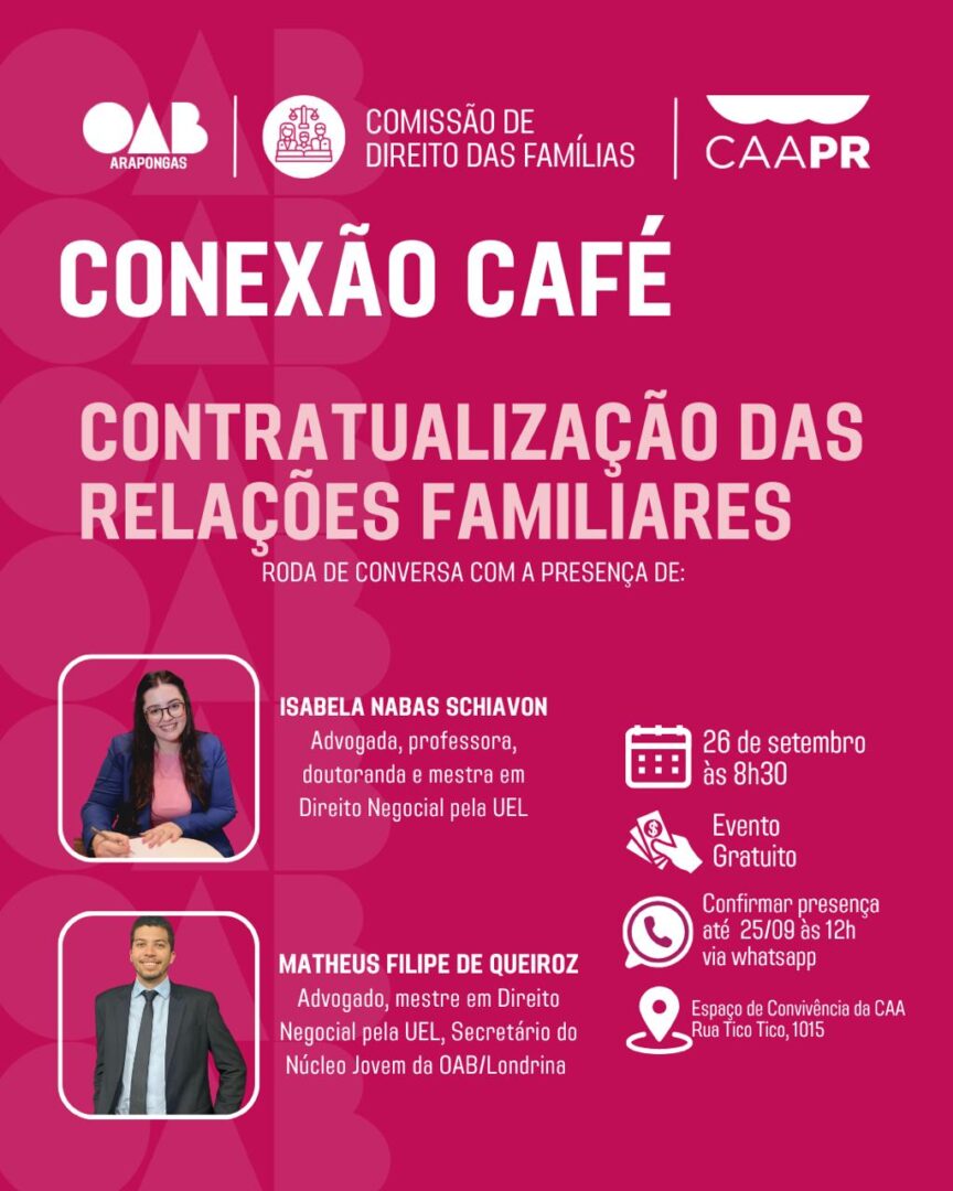 #ParaTodosVerem: Card em fundo rosa com logomarcas da OAB Arapongas, Comissão de Direito das Famílias e CAAPR no topo. Título “Conexão Café – Contratualização das Relações Familiares” em destaque. Abaixo, fotos dos palestrantes com suas respectivas descrições. Ícones ilustram a data (26 de setembro às 8h30), evento gratuito, confirmação até 25/09 às 12h via WhatsApp e local: Espaço de Convivência da OAB Arapongas.