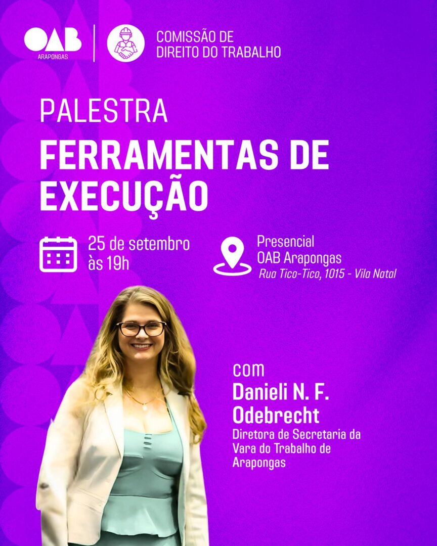 #ParaTodosVerem: Card em tons de roxo e rosa, com as logos da OAB Arapongas e da Comissão de Direito do Trabalho no topo. Ao centro, o título “Ferramentas de Execução” em letras grandes e brancas. À esquerda, ícones informam a data “25 de setembro às 19h” e o local “OAB Arapongas – Rua Tico-Tico, 1015 – Vila Natal”. À direita, a palestrante Danieli N. F. Odebrecht aparece sorrindo, com roupa clara. Abaixo, a descrição do cargo: Diretora de Secretaria da Vara do Trabalho de Arapongas.
