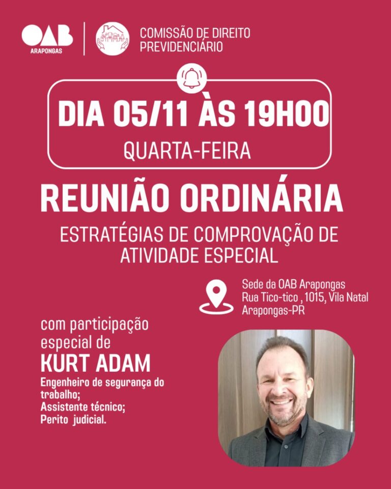A Comissão de Direito Previdenciário da OAB Arapongas convida todos(as) os(as) advogados(as) e membros da subseção para participarem da Reunião Ordinária, com o tema: